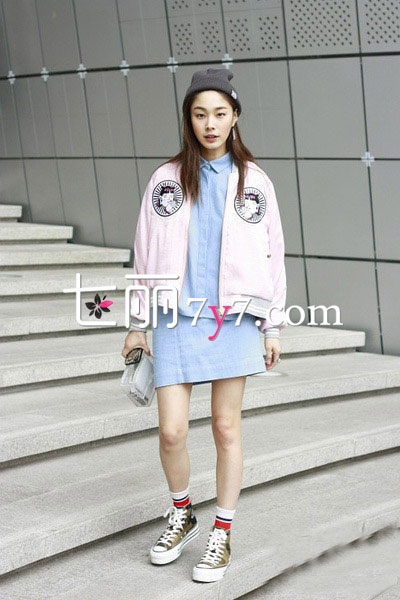 搭配看点:浅粉色的棒球服外套,较为宽松的款式,色彩上清新减龄,内穿浅蓝色宽松衬衫,配上同色短裙,反而显得清爽干净许多,穿上厚底鞋,整个装扮很有萌系少女范。