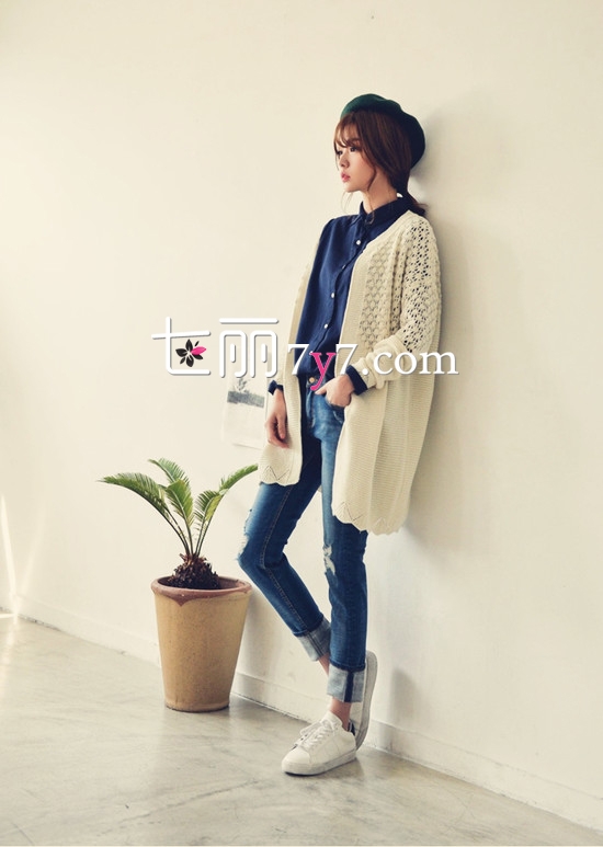 LOOK 3:镂空针织开衫+衬衣+破洞牛仔裤
