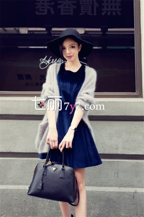 搭配看点:淡雅的灰色毛绒针织开衫搭配高雅的宝蓝色连衣裙,再搭配一顶宽檐帽和一款精致的皮质手提包,非常具有女王范儿,再搭配一晃黑色浅口高跟鞋气场更加强大。