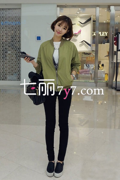 搭配看点:简洁大方的短款军绿色外套,是韩版服饰最常见的,喜欢低调随性的女孩们建议试试看,内穿百搭白色T,下身紧身小脚裤,经典的黑色最显瘦,出游或逛街都好看哟!