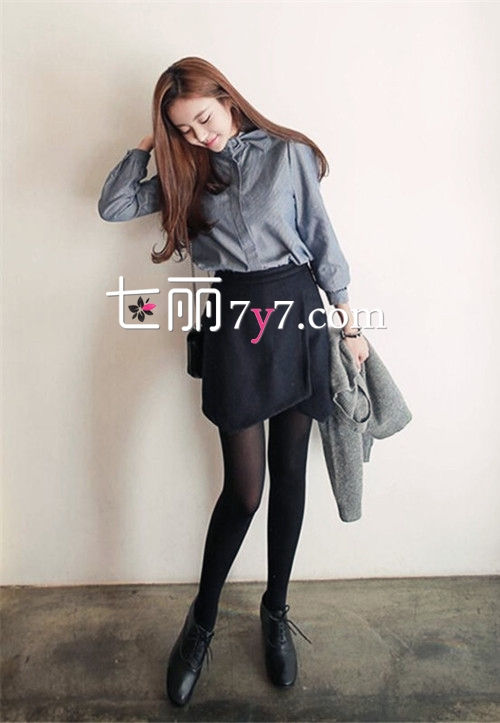 搭配看点:灰色休闲衬衫别致的领口设计更具甜美的少女气息,搭配不规则剪裁半身裙个性又不显沉闷。黑色丝袜与黑色牛津鞋统一的色系让双腿更加纤长,再搭配一款精致的MINI链条包,十足清新韩范儿。