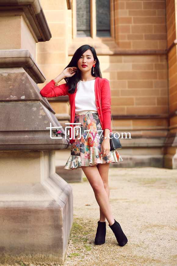 搭配看点:今天想走的是淑女风?这一款印花鱼尾裙的搭配你当然值得拥有。暖色调的印花看上去活泼又女人,内里可以随意搭配一件白T,红色针织开衫的搭配会让人气色瞬间提升,十分适合温暖的春天。