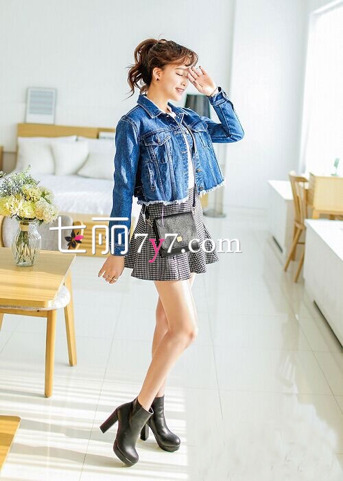 搭配看点:深色的牛仔外套,带些怀旧复古的味道,让服饰变得更有个性,下摆处磨破的设计显独特,内穿白色上衣,下身配上格子短裙,高腰设计,拉长身材比例,穿上高跟短靴后,轻松秀出大长腿!