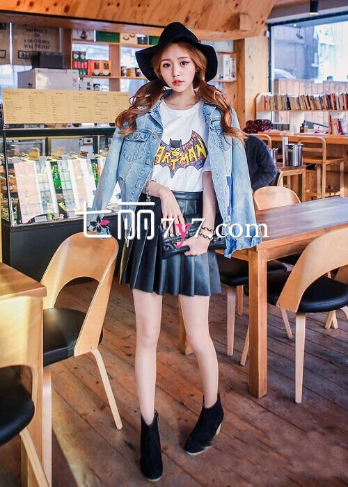 搭配看点:浅色短款的牛仔外套,带些洗白的风格,内穿百搭白色T,下身配上黑色皮质短裙,用帅气的味道,加上甜美俏皮风,穿上高跟短靴,让矮个子女生变得高挑许多,整个装扮又时髦有型!
