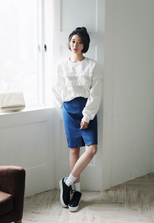 LOOK 5:白色流苏卫衣+牛仔半身裙+休闲鞋
