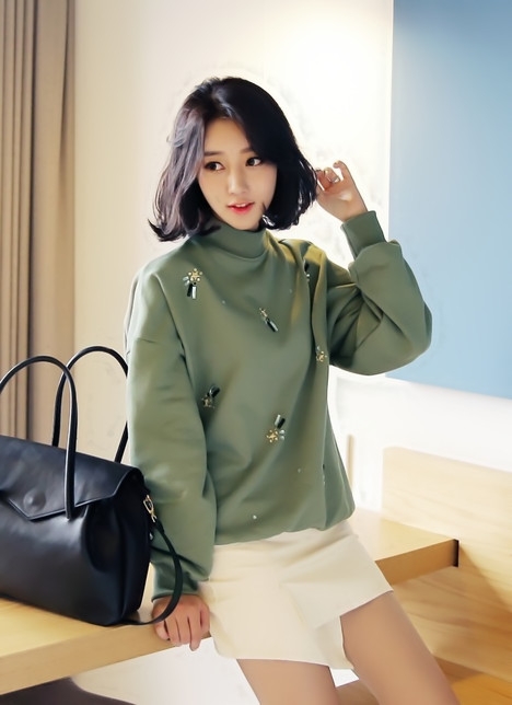 LOOK 11:豆绿色卫衣+不规则剪裁半身裙