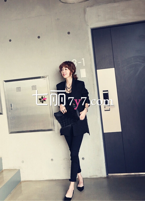 搭配看点:这样的搭配非常干练,同时也很显瘦,不过略显沉闷。如果喜欢这样的风格,记住内搭T恤的衣领一定不能小,不然整个身体都被黑色包住了,适当的露才性感。同时,长裤裤脚一定要卷起,不然就选择九分或七分牛仔裤,露出脚踝更加时髦。简约的平底鞋是春季大热的单品,个子娇小的MM也可以选择搭配浅口高跟鞋,一样的耐看哦。当然,潮流感十足的手拿包和脖间的项链也为整个造型加分不少。