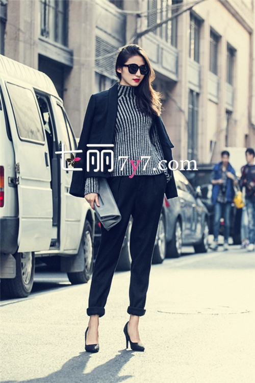 搭配看点:西装套装也是职场MM必备的时尚单品,首选当然是黑色,白色和粉色近来比较流行,不过搭配比较花心思哦。帅气的黑色小西装套装内搭黑灰色竖条纹打底衫,摩登感十足,再搭配一双黑色浅口高跟鞋拉长腿部线条,气场更加强大,黑色墨镜和手拿包很有职场女王范儿。也可以选择内搭简约的素色T恤或衬衣,比较容易驾驭哦,但是配饰细节上一定要搭配潮流感较强的单品才抢眼。