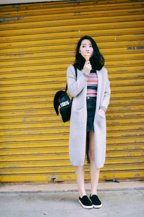 LOOK 7:针织开衫+彩色针织内衫+牛仔半身裙+乐福鞋