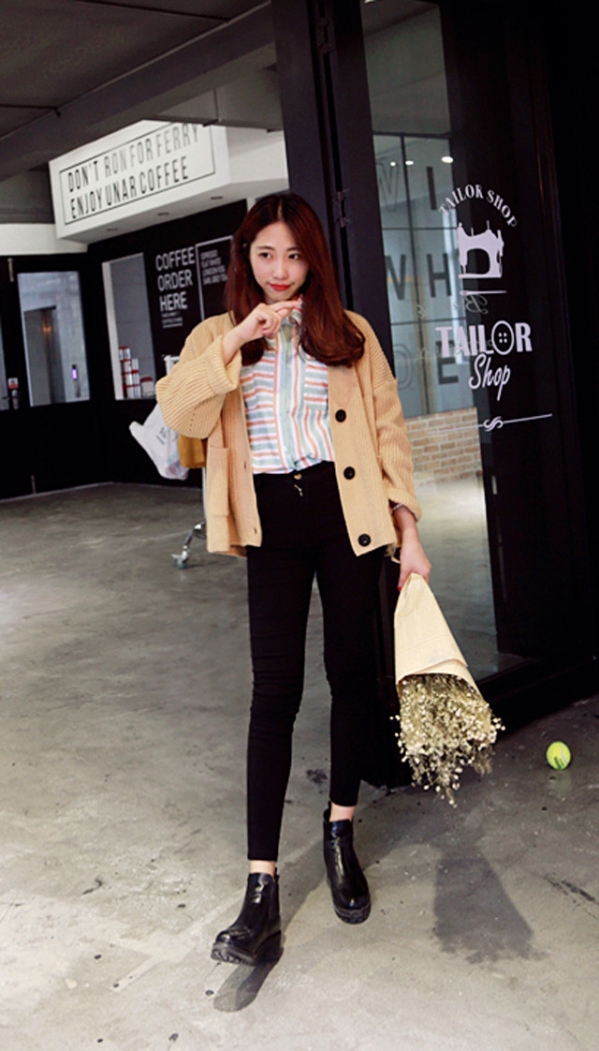 LOOK 8:针织开衫+条纹拼色T+小脚裤+短靴