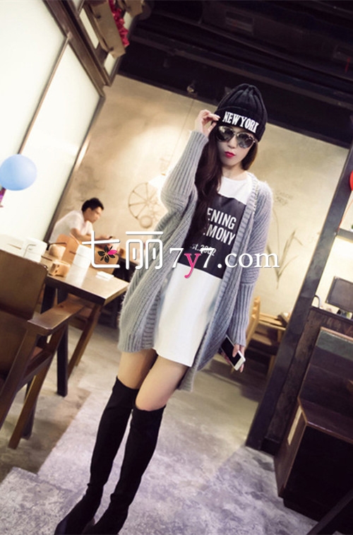 搭配看点:灰色针织开衫搭配T恤连衣裙,休闲又很有街头范儿,一双黑色及膝长靴分分钟打造迷人长腿,墨镜和奶嘴帽让造型更加时尚有范儿。