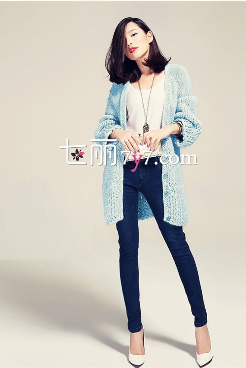 搭配看点:蓝色针织开衫外套搭配白色吊带十足清新范儿,下装搭配深蓝色牛仔裤,色彩上与针织开衫呼应更具视觉美感,一双白色浅口高跟鞋拉长双腿线条,同时与吊带色彩呼应,让整个造型充满旋律感和时尚气息。脖间的项链饰品让造型更加丰富,这样的造型非常适合职场MM尝试哦。