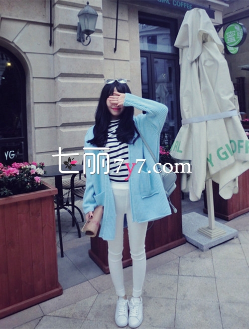 搭配看点:蓝色针织开衫外套内搭黑白条纹T,很有学院气息,比较适合学生MM尝试,下搭白色打底裤,无比清新。鞋子可以选择根据个人喜好选择平底鞋或球鞋,建议搭配尖头平底鞋更加有范儿哦。