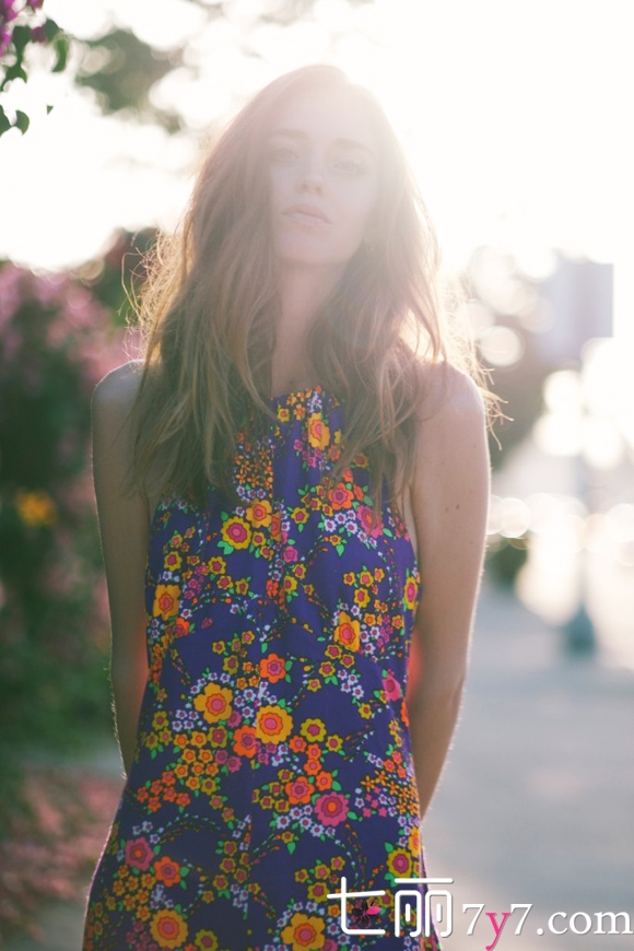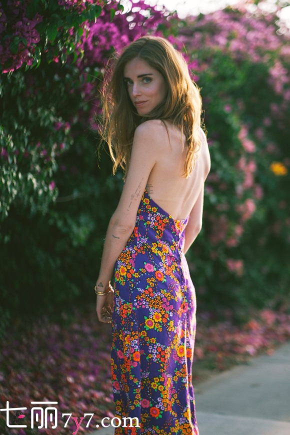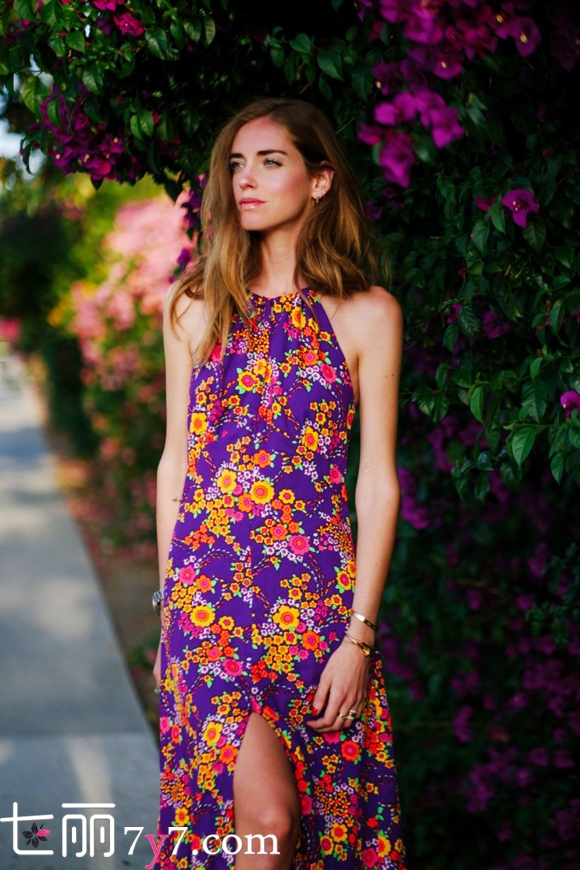 搭配看点:这款小雏菊印花连衣裙走的是清新森女系风格,自然散开的一头微卷秀发随意垂落在肩膀,就像一位闲逛在海滩的摩登女郎。高叉与露背的设计又给这条裙子增添了性感冶艳的风采,搭配手上细细的金属色手环也是别有风情。