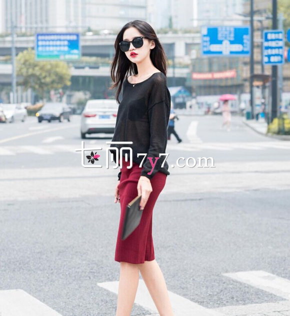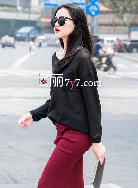 搭配看点:黑色的透明针织罩衫,经典又性感,搭配一条小分叉包臀中裙,女人味十足。酒红色与黑色的搭配非常契合。