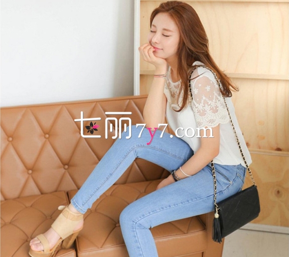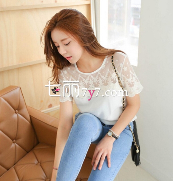 雪纺蕾丝透明短袖+浅蓝色牛仔裤