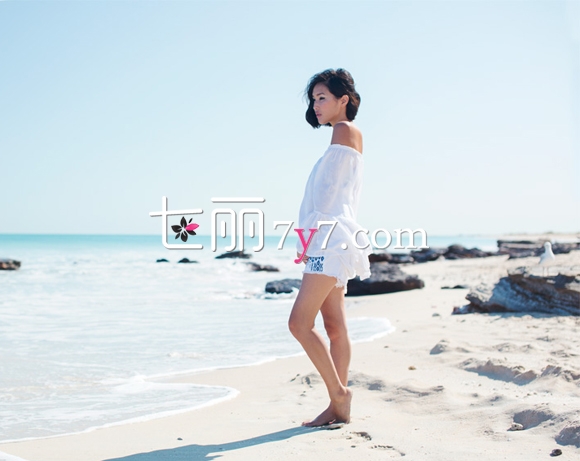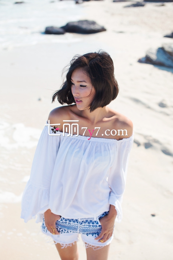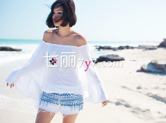 搭配看点:这款白色喇叭袖露肩微透上衣把公主风与性感风完美地结合了起来,纯白的颜色与荷叶边的设计非常清纯可爱,将两边肩膀露出又给整体带来性感妩媚的感觉。下身搭配一条短短的磨边热裤,名族风印花是亮点。