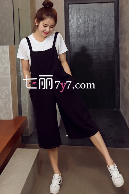 搭配看点:宽松的黑色背带裤搭配简约的白色T恤非常清爽个性,运动鞋黑白拼色呼应服饰色彩,整个造型非常的简约大气,不管是出街还是聚会都非常适合哦。