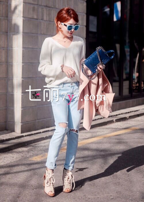 搭配看点:短款的V领针织衫,清新的米色,加上稍显性感的镂空设计,V领展示性感锁骨,下身穿破洞牛仔裤,脚踩一双米色鱼嘴鞋,浅色的风格,让整个装扮很是优雅知性。