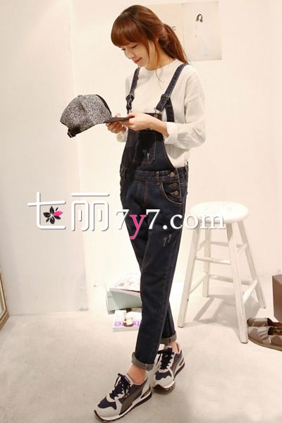 搭配看点:休闲深色的牛仔背带裤,较为宽松的款式很显瘦,经典的风格加上细节处设计,显得格外独特,上身穿白色衬衫,脚踩一双运动鞋,很有学生范味道!