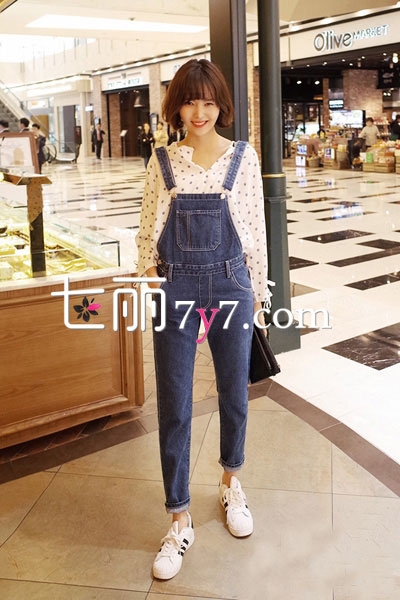 搭配看点:小脚风格的深色牛仔背带裤,颜色和版型都有韩系的味道,加上口袋设计可爱许多,上身穿波点衬衫,V领带些小性感气息,整个装扮可爱又很俏皮!