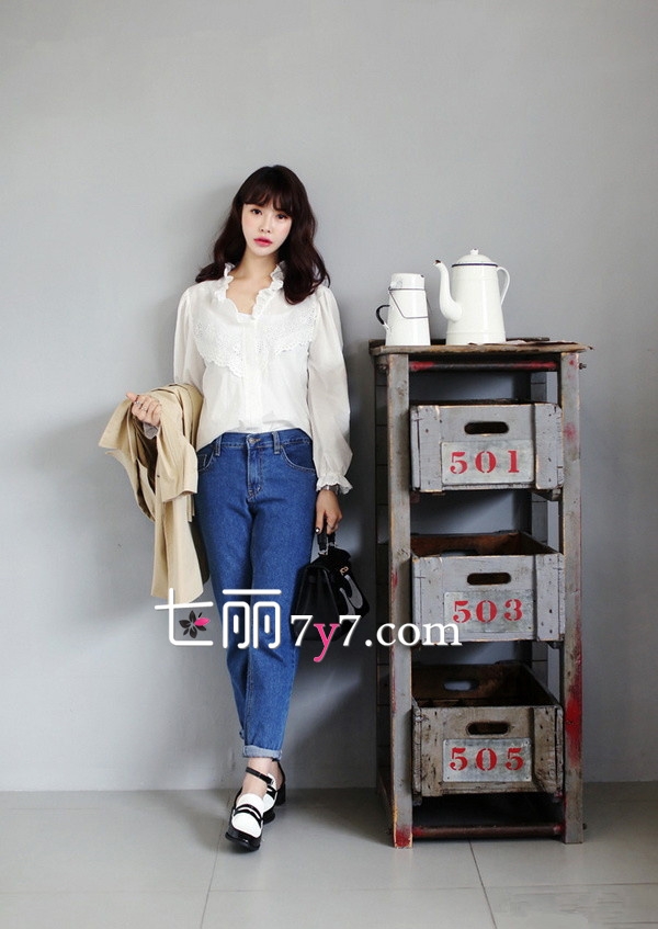 搭配看点:荷叶领白衬衫满足了mm对小清新范的要求,,领口略低,露出性感的锁骨,搭配宽松蓝色牛仔裤,少了紧身牛仔的束缚更能体现出韩式风格,脚踩黑白相间单鞋十分具有休闲感,配上手提包包,整个穿搭洋溢这清新迷人风采。