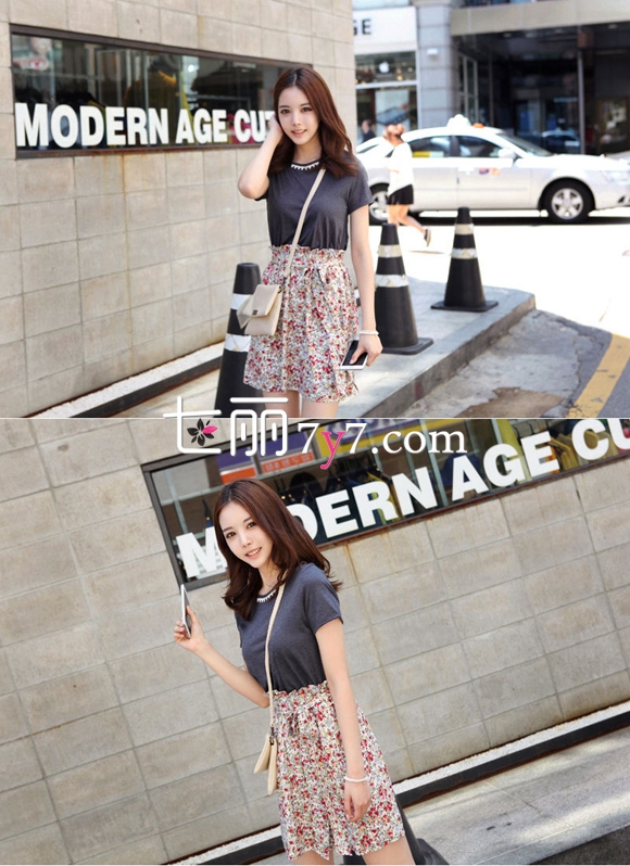 搭配看点:若你的裙子的碎花太细太密而且颜色亮丽,不妨搭配一件简单的深灰色棉质休闲T恤来中和色彩,清新中透着休闲街头的味道,领口饰以小巧细密的装饰,又加入了几分甜美可爱。