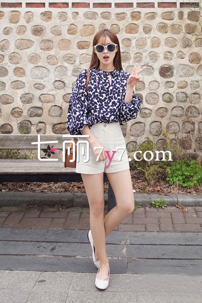 搭配看点:蓝底白色碎花雪纺衫,较为宽松的设计加上时尚韩版款式,挖空的领口剪裁,显得既经典又有些性感,下身穿白色高腰短裤,拉长下半身比例,清爽大方清秀出活力!