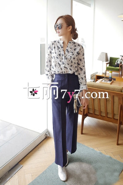 搭配看点:淡色的印花雪纺衫,用小V领口设计,让服饰变得经典大方,同时又有些小性感,下身穿上藏蓝色高腰长裤,拉长身材比例,突出高挑身材,阔腿设计显得更有型,也有摩登职业范!