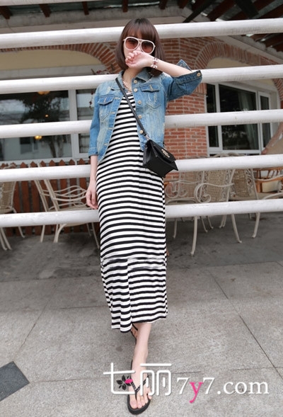 一款牛仔外套搭配时尚飘逸的条纹休闲长裙,这样的时髦混搭,显高显瘦还迷人抢眼,时尚出街赚足回头率。
