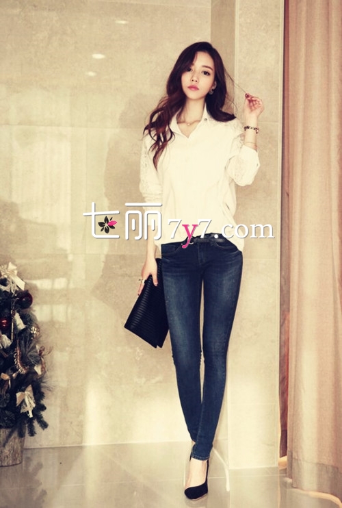 LOOK 4:白色雪纺衫+蓝色紧身牛仔裤+高跟鞋