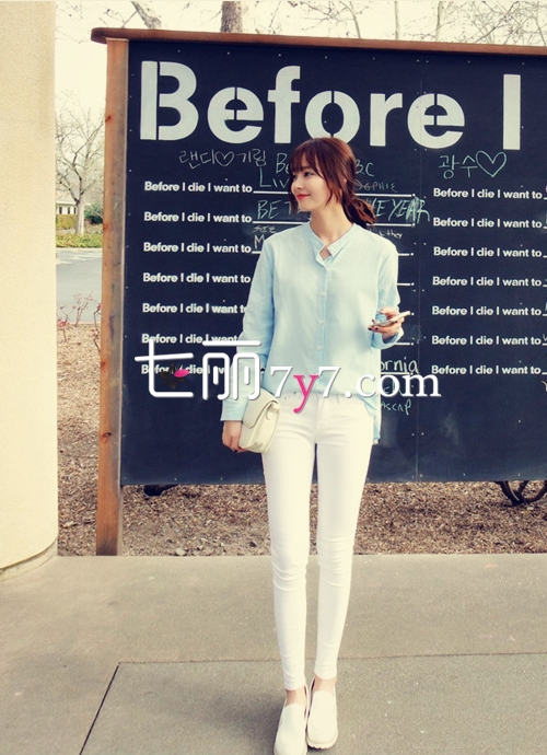LOOK 5:水蓝色雪纺衫+白色紧身牛仔裤+平底鞋