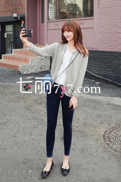 搭配看点:浅灰色的针织开衫,适中的长度,简约的韩版款式显得格外好看,内穿白色衬衫,知性大方的风格很迷人,下身穿上黑色小脚裤,搭配小皮鞋,清爽的干净风格很舒适!