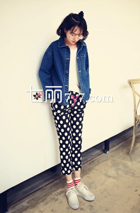 搭配看点:牛仔衣搭配白T是最省事的了,当然像搭配白色衬衣也是同理,下装搭配一条九分裤很有潮范儿,不过这种大波点九分裤还是不做推荐,建议选择黑色九分哈伦裤,将裤脚卷起,更加耐看和有气场。