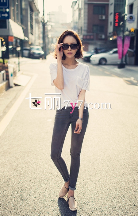 搭配看点:白色T恤是基本款,同时也是每个时尚菇凉必备的潮流单品,偏爱欧美风的菇凉衣柜里应该不只有一件白T哦。搭配灰色小脚裤,将T恤下摆束进裤头更显利落帅气,鞋子选择时下正热的乐福鞋,兼具时尚和舒适感。