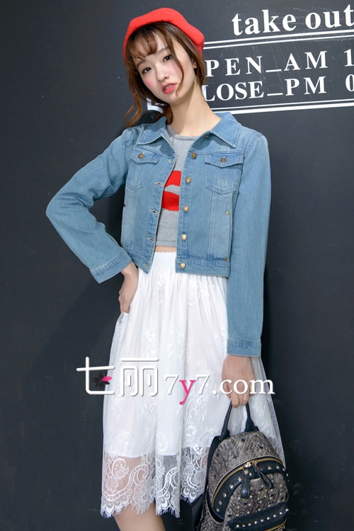 搭配看点:身穿浅色短款牛仔上衣,简约中透露出清新感,内搭嘴唇印花T恤,尽显甜美少女形象,下穿白色蕾丝半身裙,洋溢出纯洁甜美的味道,出街这么穿绝对的惹人爱,头戴红色贝雷帽为整体添加了几分可爱范。