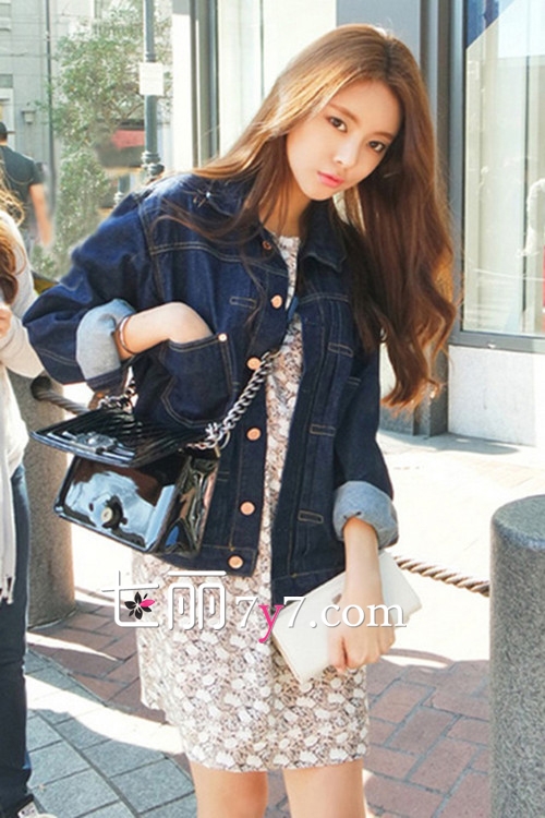 搭配看点:这款宽松的深色牛仔外套,洋溢出十足韩范,两边衣袖卷起,非常具有个性的DIY穿法,与印花连衣裙搭配,给人满满的韩式小清新风格,配上链条黑色包包,让人眼前一亮的韩范搭配哦。
