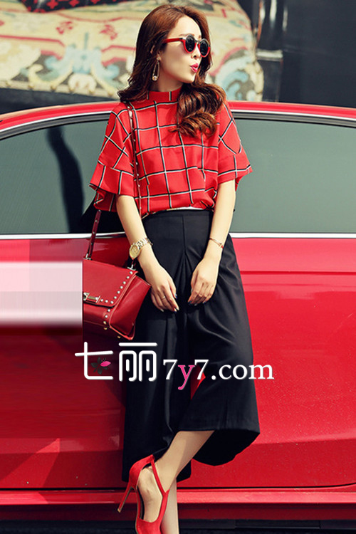 搭配看点:身穿宽松黑色阔腿裤给十分舒适休闲的感觉,与红色格子衬衫搭配,色彩鲜明打眼非常吸引人们的目光,脚踩红色细跟高跟鞋,瞬间充满了女人味,配上包包与墨镜的点缀,更是彰显十足女性魅力。