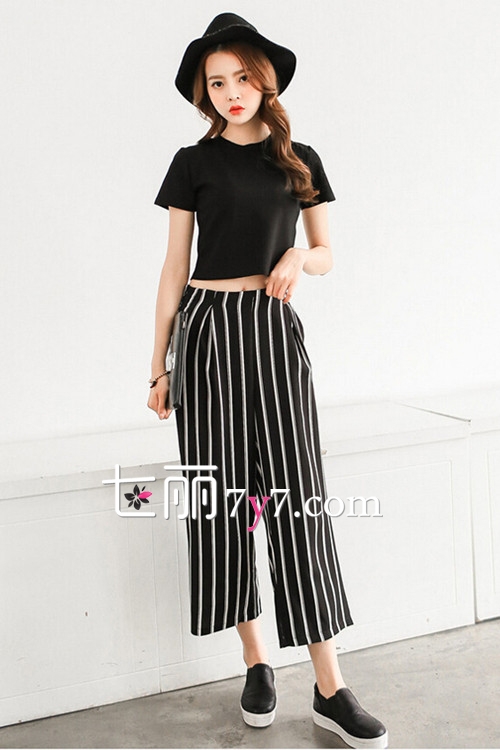 搭配看点:身穿条纹式阔腿裤,简单却十分nice,与黑色高腰T恤,露出S曲线的小蛮腰尽显性感魅力,配上一双黑色懒人鞋,具有几分休闲范哦。