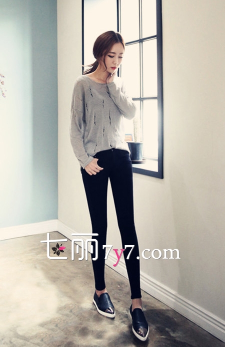 LOOK 4:镂空针织衫+黑色小脚裤+懒人鞋