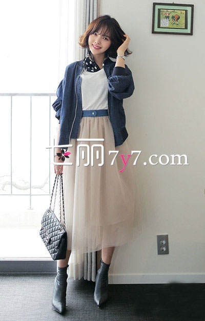 搭配看点:裸色的半身长裙,轻盈的裙摆被风吹起来,显得格外的唯美有仙女范,外穿的休闲风格牛仔外套,显得时髦有型,脚踩一双墨绿色高跟鞋,配上链条包尽显名媛气质。