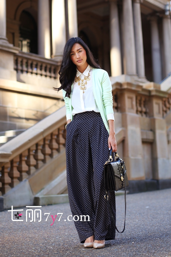 搭配看点:甜美清新的薄荷绿针织开衫搭配白色衬衫,给呆板的职场带来几分俏丽活泼的色彩,白色小波点阔腿裤的加入一点儿也不会影响职业装的干练感,而是给整体带来了几分休闲的味道。胸前精致的装饰性项链增添年轻OL的时尚优雅感。