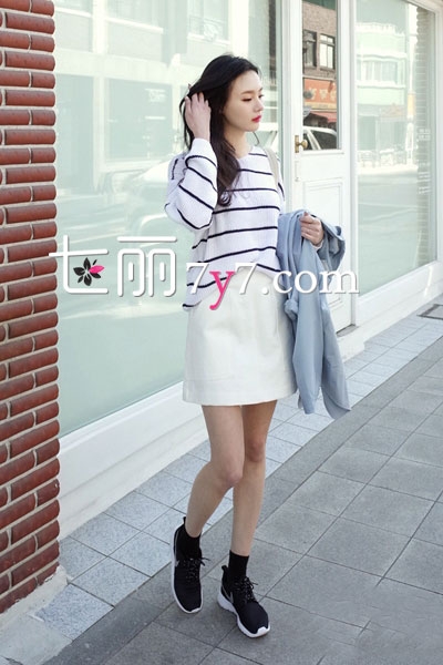 搭配看点:有间隔距离的黑白色条纹衫,很舒适的服饰,穿出了清爽的味道,下身穿白色包臀裙,既能展示出优雅,又有几分随性,加上慵懒的造型,脚踩一双运动鞋,简约方便随性十足!