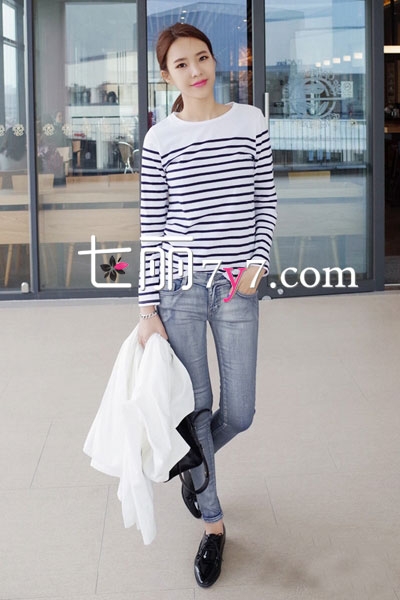 搭配看点:横条纹的黑白色条纹衫,整个服饰设计其实很简单,正因为这种别样的干净清爽味道,显得格外好看,下身穿身牛仔小脚裤,浅色洗白的风格刚刚好,整体装扮又不失去气质!