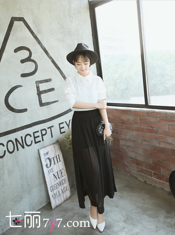 搭配看点:简单经典的白色衬衫属于百搭款,与黑色长裙的搭配自然是不会失误,雪纺的材质,垂感极佳,穿着非常的清爽飘逸。内短外长的设计可以让你隐隐约约地露出纤长玉腿,有种低调的性感。配上一顶绅士帽,又给整体搭配增添了几分英伦风。