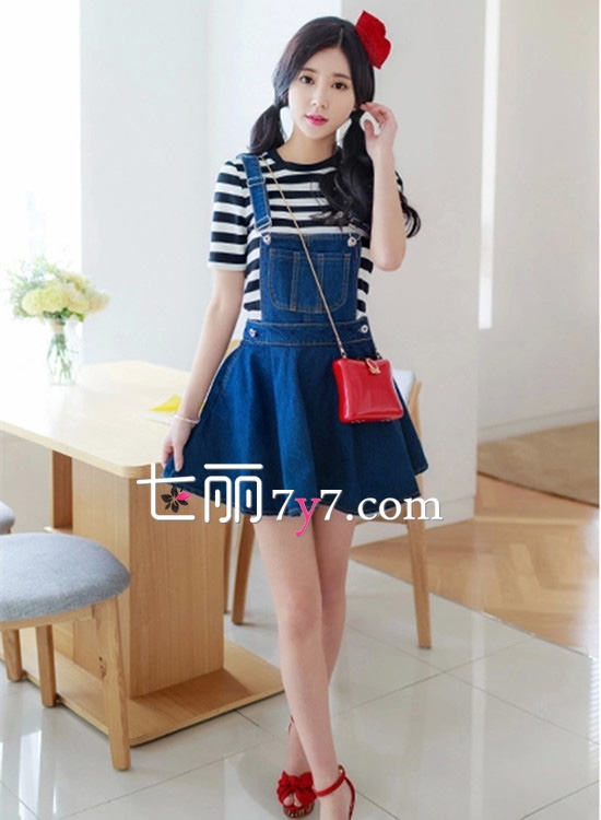 牛仔背带裙+黑白条纹T恤