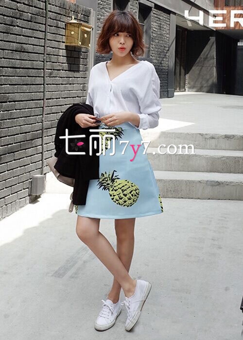 搭配看点:水蓝色的高腰A字裙,稍长的款式,加上A字型设计,适合微胖女生遮挡赘肉,上身穿V龄白色上衣,内扎穿法,拉长比例线条,穿上小白鞋,很显小清新。