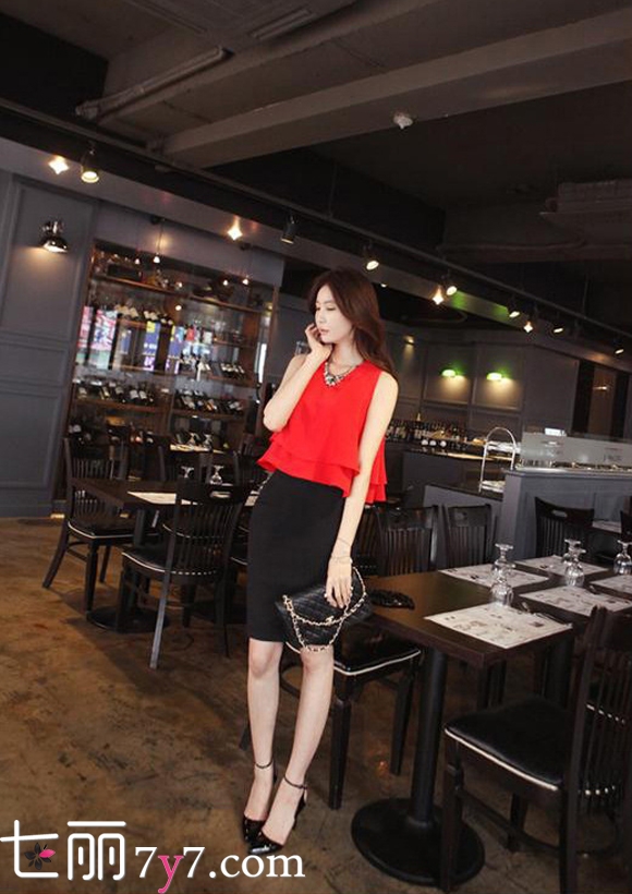 大红色雪纺荷叶边上衣+黑色包裙