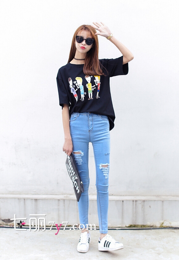 宽松款图案印花黑T+浅蓝色紧身破洞牛仔裤+休闲运动鞋