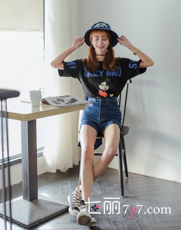 搭配看点:T恤搭配牛仔短裤是最具休闲意味的。将上身的黑色T恤收进高腰的牛仔裤,在视觉上可以让你的腰身尽现,闪耀的亮片组合而成的米奇头像可爱有趣,感觉新潮而不会太幼稚。